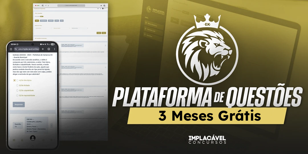 Garanta 3 meses de acesso completo à Plataforma de Questões da Implacável Concurso e estude com profundidade para conquistar sua aprovação em concursos de Guardas Municipais. Com mais de 10 mil questões atualizadas, separadas, organizadas e produzidas conforme os últimos concursos das principais bancas do país, a plataforma oferece uma preparação contínua, estratégica e totalmente alinhada aos editais.